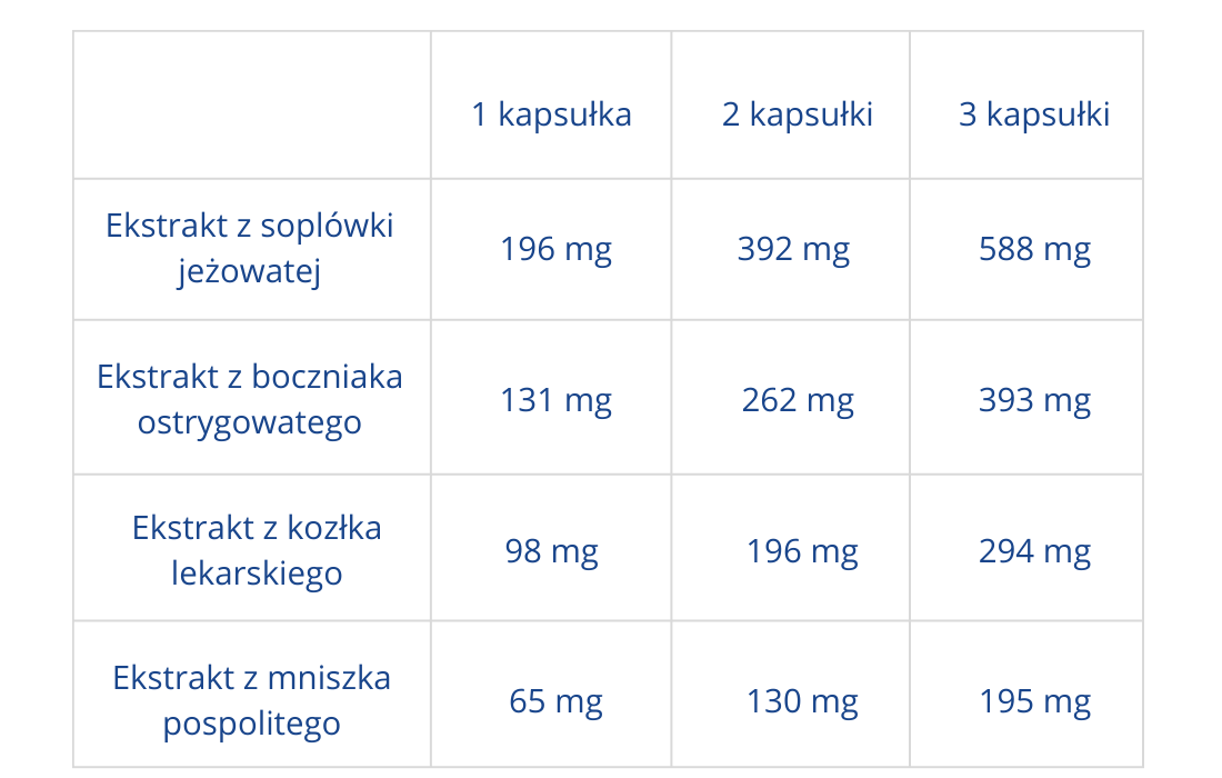 Składniki: ekstrakt z soplówki jeżowatej (Hericium erinaceus), ekstrakt z boczniaka ostrygowatego (Pleurotus ostreatus), kapsułka roślinna (HPMC), ekstrakt z kozłka lekarskiego (Valeriana officinalis), ekstrakt z mniszka pospolitego (Taraxacum officinale), stabilizator – sole magnezowe kwasów tłuszczowych.